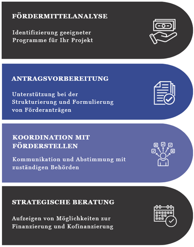 Wir unterstützen Sie dabei, die passenden Fördermöglichkeiten zu identifizieren, Anträge korrekt vorzubereiten und Zuschüsse zuverlässig zu sichern. So schaffen Sie finanzielle Entlastung und Planungssicherheit.
